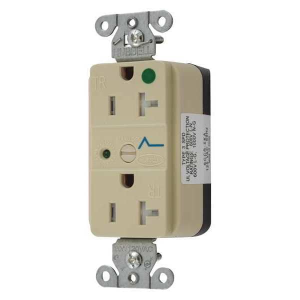 The HUBBELL SNAPConnect® Receptacle is a 20 A, 125V AC flush mount duplex outlet suitable for use in commercial and hospital environments. This modular receptacle includes connectorized wiring compatible with SNAPConnect system; does not require traditional pigtail wiring methods. The device includes integrated surge protection feature and an LED indicator, with a tamper-resistant design intended for indoor use in dry locations.