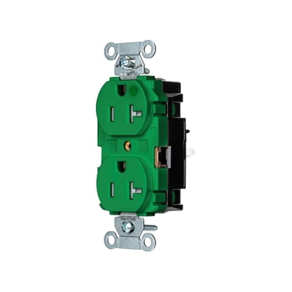 Receptacle, Connection Orientation Straight, Cover Type No Cover, Current Rating 20 A, GFCI No, Grounding Grounded, Hazardous Location Specification Not Applicable, Housing Color Green, Housing Material Thermoplastic, Mount Type Surface, NEMA Enclosure Rating 1, NEMA Receptacle Configuration 5-20R, Number of Gangs 1, Number of Poles 2, Number of Wires 3, Phase Single, Polarized Yes, Receptacle Type Duplex, Resistance Properties Tamper Resistant