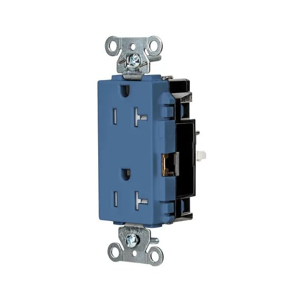Receptacle, Connection Orientation Straight, Cover Type No Cover, Current Rating 20 A, GFCI No, Grounding Grounded, Hazardous Location Specification Not Applicable, Housing Color Blue, Housing Material Thermoplastic, Mount Type Surface, NEMA Enclosure Rating 1, NEMA Receptacle Configuration 5-20R, Number of Gangs 1, Number of Poles 2, Number of Wires 3, Phase Single, Polarized Yes, Receptacle Type Decorator Duplex, Resistance Properties Tamper Resistant