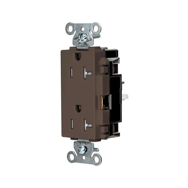 Receptacle, Connection Orientation Straight, Cover Type No Cover, Current Rating 20 A, GFCI No, Grounding Grounded, Hazardous Location Specification Not Applicable, Housing Color Brown, Housing Material Thermoplastic, Mount Type Surface, NEMA Enclosure Rating 1, NEMA Receptacle Configuration 5-20R, Number of Gangs 1, Number of Poles 2, Number of Wires 3, Phase Single, Polarized Yes, Receptacle Type Decorator Duplex, Resistance Properties Tamper Resistant