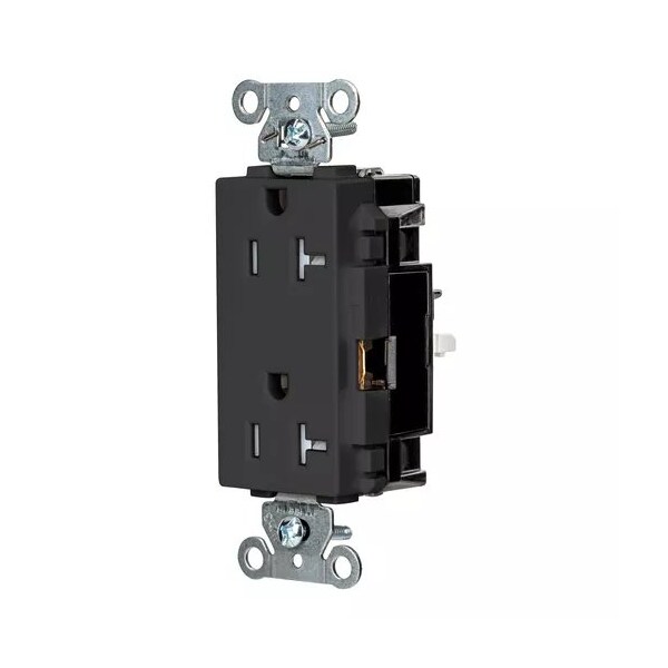 Receptacle, Connection Orientation Straight, Cover Type No Cover, Current Rating 20 A, GFCI No, Grounding Grounded, Hazardous Location Specification Not Applicable, Housing Color Black, Housing Material Thermoplastic, Mount Type Surface, NEMA Enclosure Rating 1, NEMA Receptacle Configuration 5-20R, Number of Gangs 1, Number of Poles 2, Number of Wires 3, Phase Single, Polarized Yes, Receptacle Type Decorator Duplex, Resistance Properties Tamper Resistant