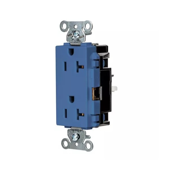 Receptacle, Connection Orientation Straight, Cover Type No Cover, Current Rating 20 A, GFCI No, Grounding Grounded, Hazardous Location Specification Not Applicable, Housing Color Blue, Housing Material Thermoplastic, Mount Type Surface, NEMA Enclosure Rating 1, NEMA Receptacle Configuration 5-20R, Number of Gangs 1, Number of Poles 2, Number of Wires 3, Phase Single, Polarized Yes, Receptacle Type Decorator Duplex, Resistance Properties Tamper Resistant