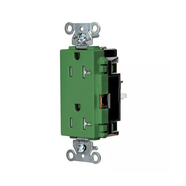 Receptacle, Connection Orientation Straight, Cover Type No Cover, Current Rating 20 A, GFCI No, Grounding Grounded, Hazardous Location Specification Not Applicable, Housing Color Green, Housing Material Thermoplastic, Mount Type Surface, NEMA Enclosure Rating 1, NEMA Receptacle Configuration 5-20R, Number of Gangs 1, Number of Poles 2, Number of Wires 3, Phase Single, Polarized Yes, Receptacle Type Decorator Duplex, Resistance Properties Tamper Resistant