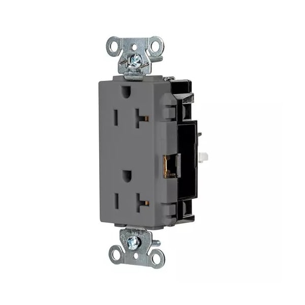 Receptacle, Connection Orientation Straight, Cover Type No Cover, Current Rating 20 A, GFCI No, Grounding Grounded, Hazardous Location Specification Not Applicable, Housing Color Gray, Housing Material Thermoplastic, Mount Type Surface, NEMA Enclosure Rating 1, NEMA Receptacle Configuration 5-20R, Number of Gangs 1, Number of Poles 2, Number of Wires 3, Phase Single, Polarized Yes, Receptacle Type Decorator Duplex, Resistance Properties Tamper Resistant