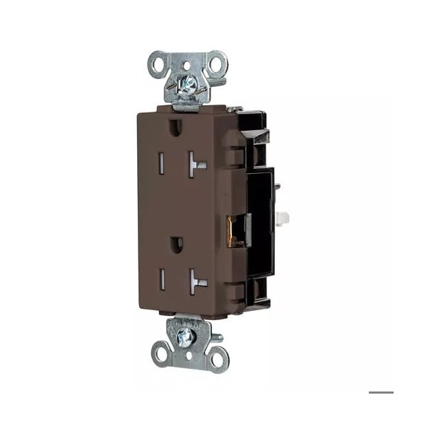 Receptacle, Connection Orientation Straight, Cover Type No Cover, Current Rating 20 A, GFCI No, Grounding Grounded, Hazardous Location Specification Not Applicable, Housing Color Brown, Housing Material Thermoplastic, Mount Type Surface, NEMA Enclosure Rating 1, NEMA Receptacle Configuration 5-20R, Number of Gangs 1, Number of Poles 2, Number of Wires 3, Phase Single, Polarized Yes, Receptacle Type Decorator Duplex, Resistance Properties Tamper Resistant