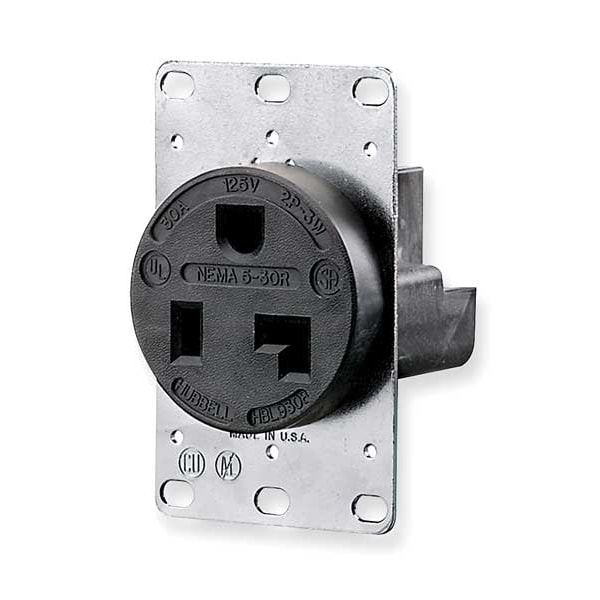 Receptacle, Connection Orientation Straight, Cover Type No Cover, Current Rating 30 A, GFCI No, Grounding Grounded, Housing Color Black, Housing Material Reinforced Thermoplastic Polyester, Mount Type Flush, NEMA Enclosure Rating 1, NEMA Receptacle Configuration 5-30R, Number of Gangs 1, Number of Poles 2, Number of Wires 3, Phase Single, Polarized Yes, Receptacle Type Single, Standards CSA Certified, NEMA WD-6, UL E2186, Voltage Rating 125V AC, Wire Connection Type Screw Terminals