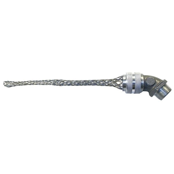 Liquid Tight Cord Connector with Strain Relief, Cord Dia. Range 0.63 in to 0.75 in, Box Connection 3/4 in MNPT, Material - Cord Connector Aluminum, External Strain Relief Material Stainless Steel, Gland Color Code No Code, Body Color - Cord Connector Silver, Number of Cords 1, Style - Connector 45 Degrees , Strain Relief Type Mesh, External Strain Relief Length 6 in, Length - Box to End of Connector 2 5/16 in, Insulated No, Standards CSA, UL, Hazardous Location Rating Not Rated