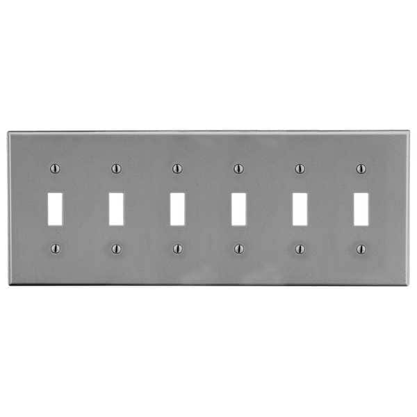 The HUBBELL Toggle Switch Wall Plate is a 6-gang, non-metallic wall plate intended for use with toggle switches. Made from polycarbonate plastic, it features a satin finish and standard size dimensions that provide coverage over standard wall openings. The plate can be used in retrofit work and installations requiring rigidity and impact resistance.