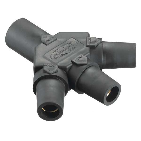 The HUBBELL Triple Connector, Series 16, is a single pole device rated for high ampacity electrical distribution. This tri-tap connector features a male-female-female-female configuration and is constructed with an insulated thermoplastic elastomer housing and brass contacts. It is intended for use in temporary or portable power connection scenarios with multiple outputs.