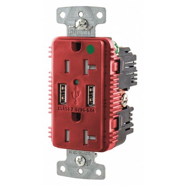 USB Charger Receptacle, Current Rating 20 A, Electrical Connection Type Straight Blade, Housing Color Red, Number of Outlets 2, Number of USB Ports 2, Number of Wires 3, Power Indicating Light Yes, Receptacle Type Duplex, Resistance Properties Tamper Resistant, USB Connection Type A, Voltage Rating 125V AC, Wire Connection Type Screw Terminals, Wiring Method Back, Side, Grade Hospital Grade, Grounding Grounded, Horsepower Rating 1 hp, Housing Material RTP, Maximum Wire Size 10 AWG