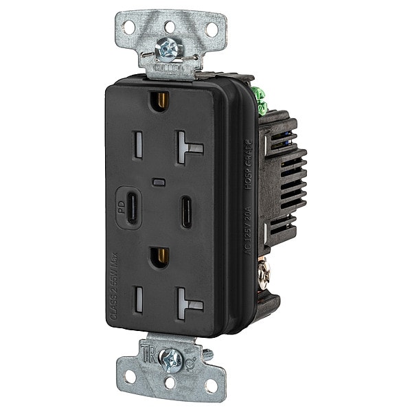 USB Receptacle, Current Rating 20 A, Electrical Connection Type Straight Blade, Housing Color Black, Number of Outlets 2, Number of USB Ports 2, Number of Wires 3, Power Indicating Light Yes, Receptacle Type Duplex, Resistance Properties Tamper Resistant, USB Connection Type A, C, Voltage Rating 125V AC, Wire Connection Type Screw Terminals, Wiring Method Back, Side, Face Plate Height 2.6 in, Face Plate Width 1.3 in, GFCI No, Grade General Use, Grounding Grounded, Horsepower Rating 1 hp