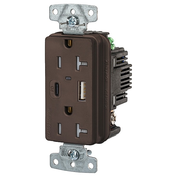 USB Receptacle, Current Rating 20 A, Electrical Connection Type Straight Blade, Housing Color Brown, Number of Outlets 2, Number of USB Ports 2, Number of Wires 3, Power Indicating Light Yes, Receptacle Type Duplex, Resistance Properties Tamper Resistant, USB Connection Type A, C, Voltage Rating 125V AC, Wire Connection Type Screw Terminals, Wiring Method Back, Side, Face Plate Height 2.6 in, Face Plate Width 1.3 in, GFCI No, Grade General Use, Grounding Grounded, Horsepower Rating 1 hp