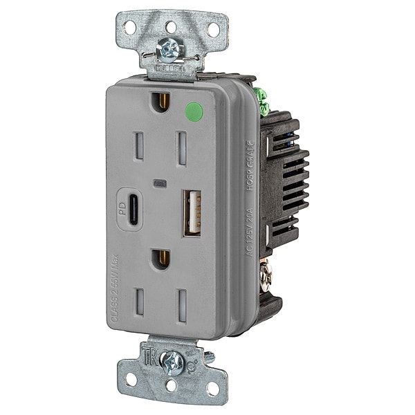 USB Receptacle, Current Rating 15 A, Electrical Connection Type Straight Blade, Housing Color Gray, Number of Outlets 2, Number of USB Ports 2, Number of Wires 3, Power Indicating Light Yes, Receptacle Type Duplex, Resistance Properties Tamper Resistant, USB Connection Type A, C, Voltage Rating 125V AC, Wire Connection Type Screw Terminals, Wiring Method Back, Side, Face Plate Height 2.6 in, Face Plate Width 1.3 in, GFCI No, Grade Hospital Grade, Grounding Grounded, Horsepower Rating 1/2 hp