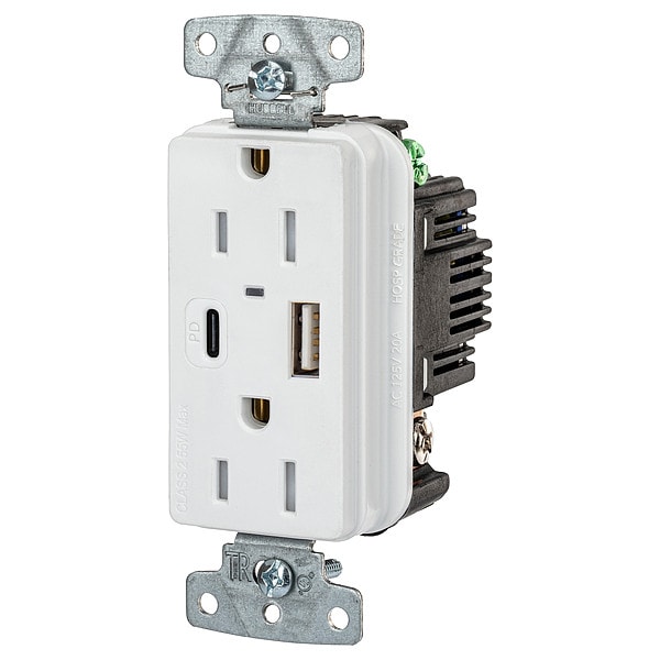 USB Receptacle, Current Rating 15 A, Electrical Connection Type Straight Blade, Housing Color White, Number of Outlets 2, Number of USB Ports 2, Number of Wires 3, Power Indicating Light Yes, Receptacle Type Duplex, Resistance Properties Tamper Resistant, USB Connection Type A, C, Voltage Rating 125V AC, Wire Connection Type Screw Terminals, Wiring Method Back, Side, Face Plate Height 2.6 in, Face Plate Width 1.3 in, GFCI No, Grade General Use, Grounding Grounded, Horsepower Rating 1/2 hp