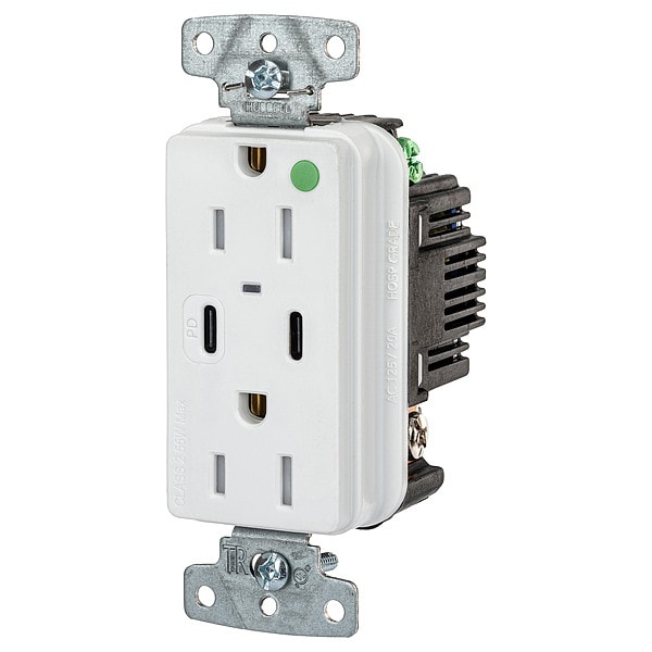 USB Receptacle, Current Rating 15 A, Electrical Connection Type Straight Blade, Housing Color White, Number of Outlets 2, Number of USB Ports 2, Number of Wires 3, Power Indicating Light Yes, Receptacle Type Duplex, Resistance Properties Tamper Resistant, USB Connection Type A, C, Voltage Rating 125V AC, Wire Connection Type Screw Terminals, Wiring Method Back, Side, Face Plate Height 2.6 in, Face Plate Width 1.3 in, GFCI No, Grade Hospital Grade, Grounding Grounded, Horsepower Rating 1/2 hp