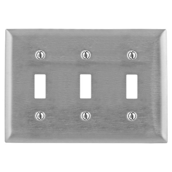 Hubbell Wiring Device Kellems, Wallplates and Boxes, Metallic Plates, 3-Gang, 3) Toggle Openings, 430 Stainless Steel
