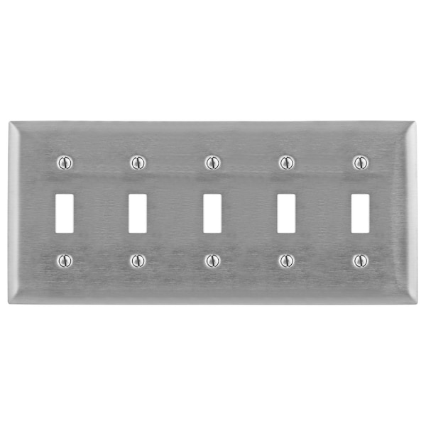 Hubbell Wiring Device Kellems, Wallplates and Boxes, Metallic Plates, 5-Gang, 5) Toggle Openings, Standard Size, Stainless Steel