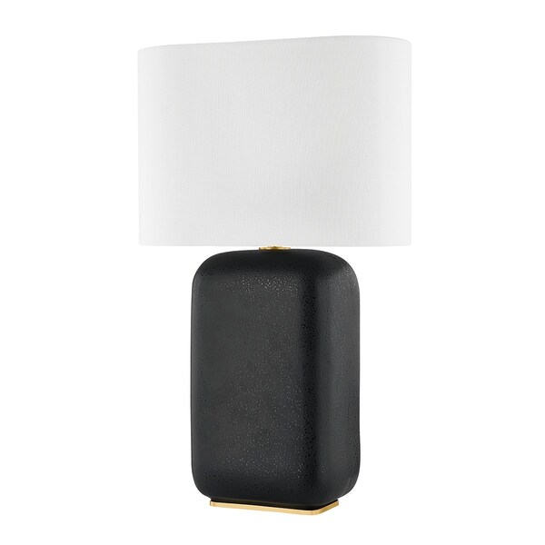 A curved white linen shade and Aged Brass accent soften the thick, rectangular form and dark finish of this table lamp. The black lava ceramic finish adds texture and has a glossy speckled effect. Arthur is a solid choice for task lighting on desks and tabletops throughout the home.
