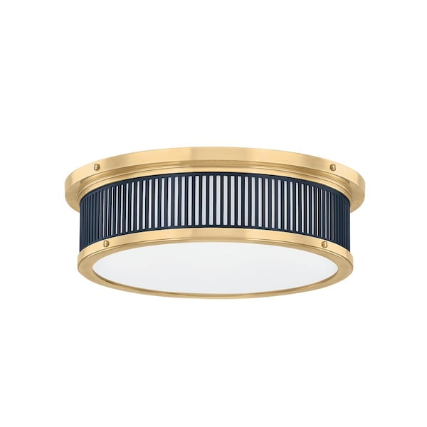 By blending classic and contemporary elements, the Ashdown family offers a new take on sophisticated ceiling lighting. Available in both square and rounded shapes, these flush mounts feature Mark D. Sikes' signature brass screw accents and a white glass shade. The distinctive geometric perforations on the frame provide another decorative detail. Choose from an Aged Brass and Darkest Blue finish combination, or an Aged Brass and Off White pairing.
