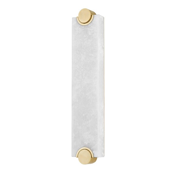 A bold, geometric take on a familiar, rectangular sconce silhouette, this modern design features oversized Aged Brass circular details on either end. The alabaster shade gives off a warm, gorgeous glow. This piece has a fresh, bespoke feel that is simple and useable.
