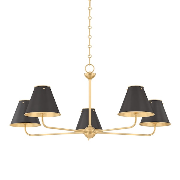 The Burghley family channels a tailored aesthetic with clean lines and sleek metal shades. Featuring Mark D. Sikes signature brass ball detail as well as stylish bolts securing the shades, Burghley makes heritage-inspired silhouettes feel fresh. In either Aged Brass and Off White or Aged Brass and Distressed Bronze, the 5-light chandelier and 2-light linear bring a sense of understated refinement to both traditional and modern interiors.