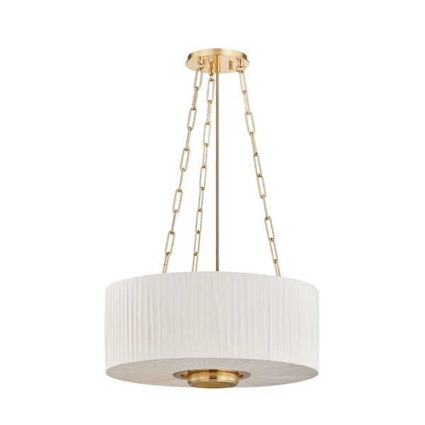 Camby balances oversized proportions with tailored details to create a sophisticated statement pendant. Supported by a triple-chain system, the pleated ivory linen shade channels a classic sense of style. An Aged Brass oculus anchors the piece, adding a focal point from below. Available in 3 and 4-light options, Camby pairs beautifully with many design schemes.