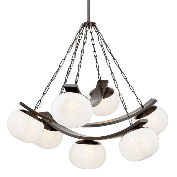 Balancing hard and soft elements, Duxbury creates a modern architectural lighting experience inspired by morning dew collecting on blades of grass. Voluminous cloud seedy glass shades are suspended from stark metal bands and chains, creating a powerful yet pleasing contrast. Duxbury is available as a 5 or 7-light chandelier with an Aged Brass or Distressed Bronze finish.