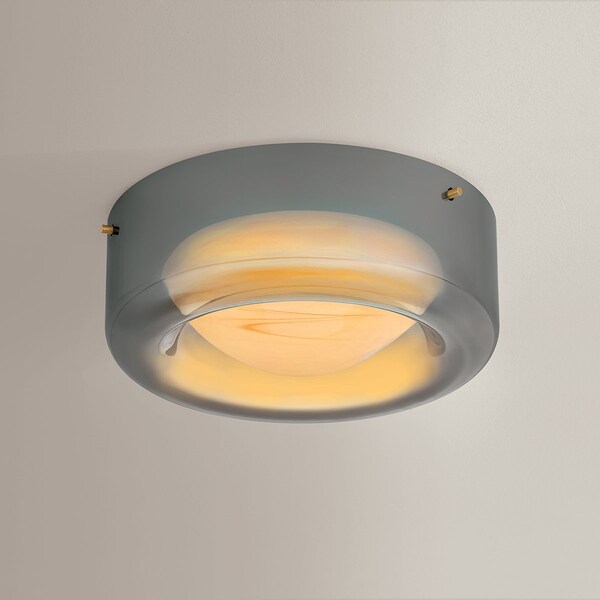 The Eldred semi flush mount brings drama to the ceiling with its dimpled form and layered glass design. An inner shade of swirling cappuccino glass is encased in a darker outer layer of moody dark smoke glass, creating a multi-dimensional glow. An Aged Brass-finished backplate frames Eldred as it emits ambient light without the harsh glare.
