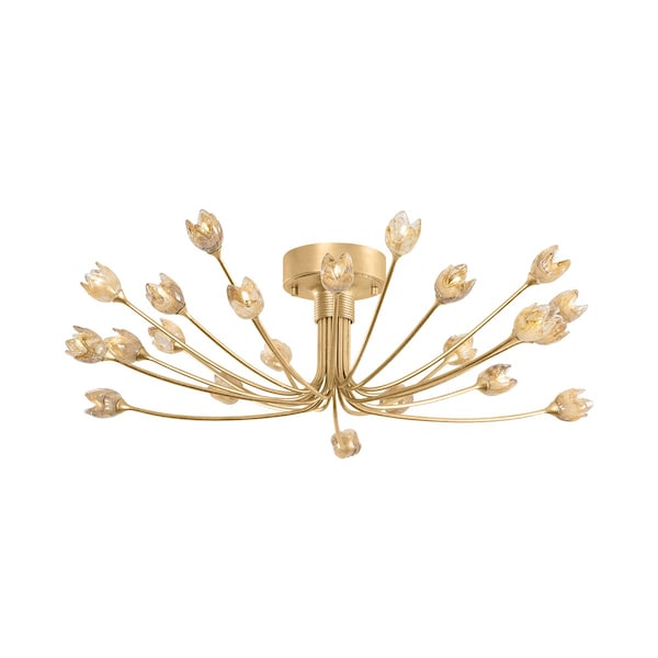 The sprawling stem-like arms and petite champagne piastre glass shades of Falkirk extend like delicate snowdrops in bloom. A Vintage Gold Leaf framework supports this whimsical close-to-ceiling fixture, adding a glamorous note. Available in two sizes, Falkirk creates a fresh, inviting statement overhead.