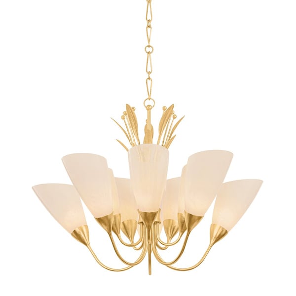 Cloud seedy glass shades bloom around a bouquet of decorative ‘leaves’ in the poetic Forest Glen family. Finished in Vintage Gold Leaf, the frame is elevated by hand-etched details, creating organic veining that looks true to nature. Available as a wall sconce, 6-light chandelier, and 10-light chandelier, Forest Glen creates an inviting lighting experience wherever it is placed.