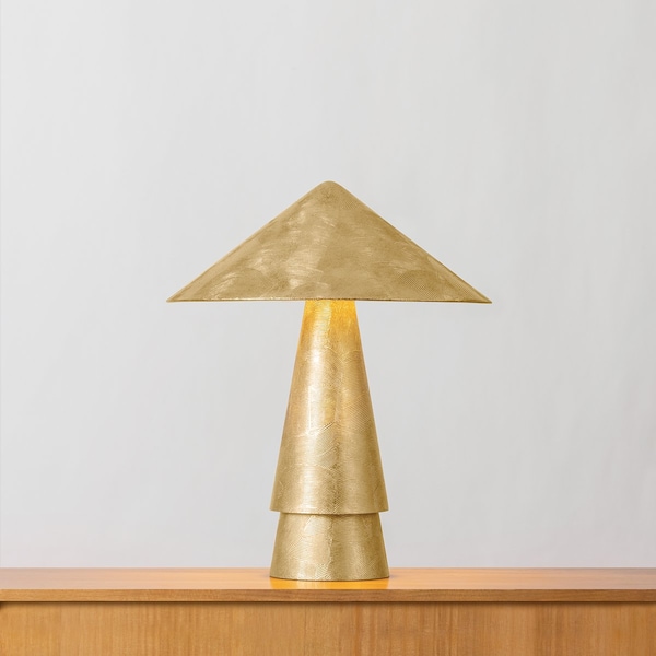 Inspired by antiquities, the Foxton table lamp cuts a bold figure with artistic geometry and textural finishes. The conical stacked base and pyramid-shaped shade provide a striking reimagination of a classic table lamp silhouette. Available in either troweled Vintage Gold Leaf or troweled Warm Silver Leaf finishes, Foxtons allover materiality amplifies its statuesque presence.
