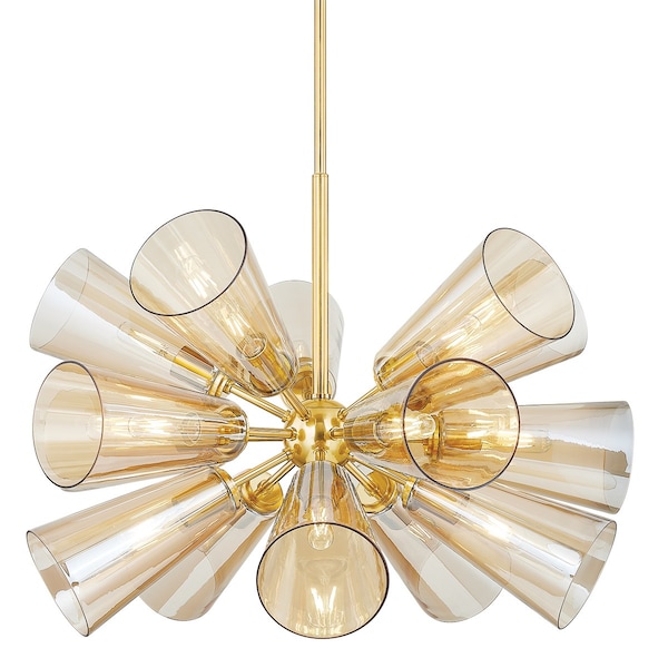 Hartwood brings a festive twist to a mid-century modern design. The clear hand-blown glass shades of this sputnik-inspired chandelier resemble a cluster of fluted glassware facing outwards. Light champagne plating on the glass combined with Aged Brass metalwork accentuates the effervescent energy. Available with 15 or 25 lights.