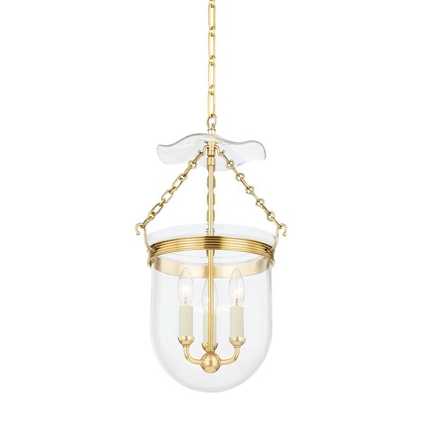 Rousham modernizes the traditional bell jar design with flowing lines and clean details such as ribbed metal banding and a stately chain, both in Aged Brass. The graceful, flowing glass that sits atop the pendant is a simple accent that draws the eye and makes the piece stand out. Part of our Mark D. Sikes collection.