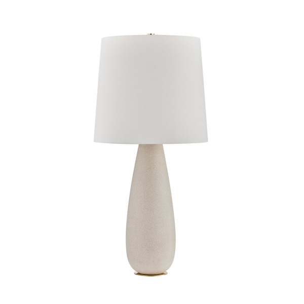 The Neelytown table lamp brings high design aesthetics to earthy interiors with an elongated silhouette and textural finish. With all-over speckling, the Textured Edgecomb glaze recalls the look of natural stone on the base. An oversized white linen shade and Aged Brass hardware let the ceramic finish remain the center of attention in this serene lamp. *Due to the one-of-a-kind nature of the medium, exact colors and patterns may vary slightly from the image shown.