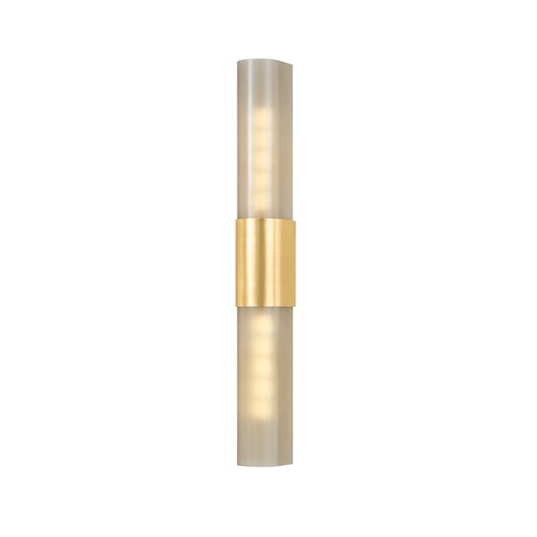 Melding bronze glass with sleek metalwork, the Somersville family includes two timeless, versatile sconces. Suited for a variety of small spaces, the bullnose shape of these fixtures creates a monolithic look. The light bronze glass is etched inside, creating a softly patinated appearance that conceals the light source. When illuminated, the Aged Brass finish of the metalwork glints off the glass shade.
