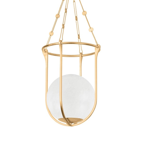 A delicate Vintage Gold Leaf cage, gracefully swirling cloud glass orb and intricate suspension chains converge to create this mesmerizing pendant light. Exhibiting a jewelry-like appearance, Verbank is enhanced by its subtle details, including circular ornaments on the chains and Art Deco-inspired curves. Like a planetary body glowing in the sky, this is a truly magical lighting experience.