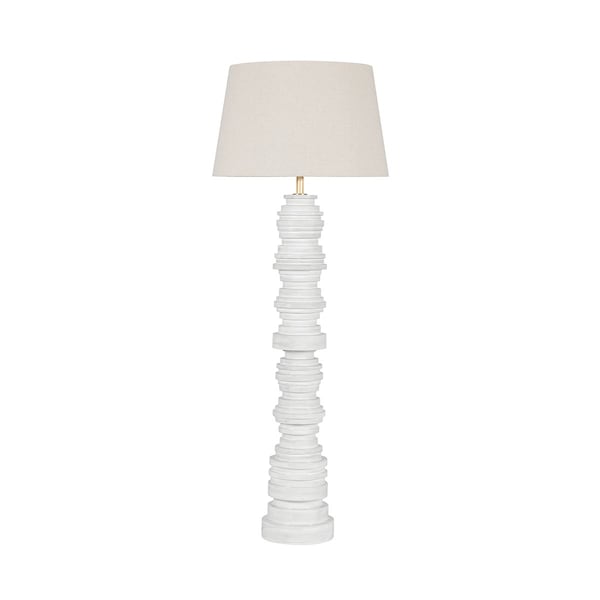 In the spirit of a cairn, this sculptural floor lamp is formed with stacked ceramic discs of varying sizes. The linen shade seamlessly continues the allover white palette, while Aged Brass metalwork adds a glimmer of warmth at the neck of this tall tower. Placed in any setting, Wayzata makes a fresh and architectural statement.