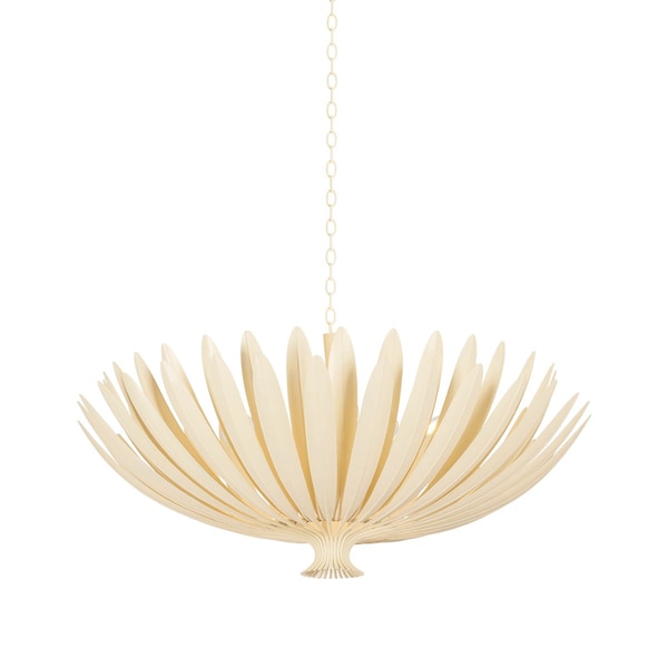 Leaning into a botanical motif, the Whitfield family is defined by elongated leaf-like metal pieces that form a glowing shade around the light source. As light emanates outwards, it filters through the layered foliage. Available as a 1-light wall sconce, a semi-flush mount with 3 lights, and three sizes of chandelier, Whitfield comes in a Vintage Gold Leaf finish or our new Cream Plaster finish, a soft alternative to white.