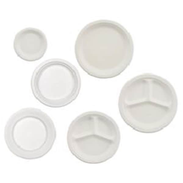 Cut oil and water resistant. Made with reclaimed fiber. Microwaveable. White. 125 plates per pack. 4 packs per case. 500 plates per case. -Three compartments. -Diameter : 10-1/4in Diameter.