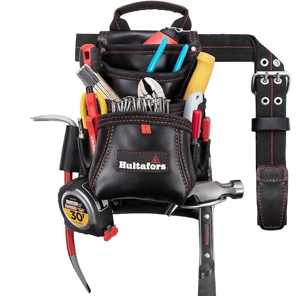 The premium quality, heavy-duty leather carpenter's nail and tool bag has four main and seven smaller pockets that hold a variety of nails, fasteners and tools and includes a hammer and leather pry bar holder and tape measure clip.