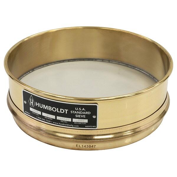Standard Stainless Steel Cloth Test Sieve, Plain Weave, Stainless Steel Screen Material, Brass Frame Material, Mesh Size Fine, Mesh Size Range Fine, Wire Dia. -, Opening Size 9 micron, Outside Dia. 8 in, Overall Depth 2 in, AASHTO M92, ASTM E11 Standards