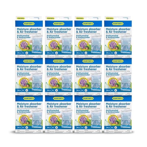 Humydry Hanging Bag Moisture Absorber and Wool Protector is a three in one device that helps protect your belongings from excess moisture damage, prevents damage caused by moths and freshens the air with a lavender and cedar scent. Our 15.9 oz dehumidifier contains active calcium chloride granules that absorb excess moisture from the air and contains cedar and lavender which naturally deters moths from laying eggs. Just simply hang our device where help is needed and let it work. Over time the moisture absorbing granules will turn into liquid which is deposited at the bottom of the bag. Absorbing excess moisture will remove musty odors and prevent mold and mildew. The natural cedar and lavender will add a pleasant scent to the air while preventing moth damage. Simply dispose of the bag once all the granules have turned into liquid, usually 1-3 months. Our hanging bags are leak proof. Great for closets, RV's, storage rooms, basements and laundry rooms. When there are no more granules in the upper bag compartment is it time to empty the liquid and replace with a new bag. Empty the liquid by cutting the bag and flushing the liquid down the toilet.