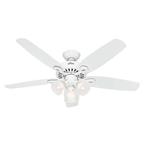 Decorative Ceiling Fan, 52 in Blade Diameter, 120V AC Voltage, 66 W Fan Watts, Phase 1, 3,468 cfm, 155/97/54 RPM RPM, Max. Mounting Height 8 to 10 ft, Number of Speeds 3, Blade Finish Snow White, Housing Finish Snow White, Number of Blades 5, Speed Controllable - Fans Yes, 0.41 A Amps, 60 Hz Hz, Max. Ambient Temp. 104 Degrees F, Light Kit 3-Light, Reversible Yes, Mount Type Angle/Flush/Standard, Fan Mounting Location Ceiling, Thermal Protection Auto, Environmental Applications Office and Desk