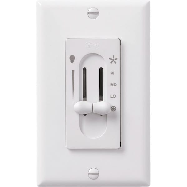 Wall mounted dual slide control provides 3 fan speeds and full range light dimming. Installs in 3-wire single gang wall box. Rocker switch plate not included. Unit will operate all brands of ceiling fans. Rated for fan 1.6A light 300W. White.