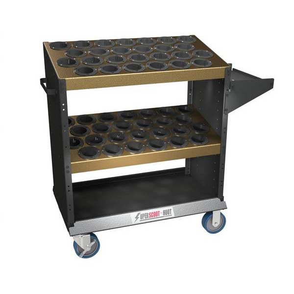 CNC SuperScoot, 50 Taper, Super-Duty, Holds Up To 52 Tools, Number of Shelves 2 Adjustable, Load Rating 1600 Lb, Width 45 1/4 In, Depth 17 1/2 In, Height 40 In, Steel, Sides and Shelves 12 Gauge, Caster Type Plastic With Rubber Edge, 2 Swivel Locking And 2 Fixed, Caster Size 5 x 1 1/2 In, Black Cart With Gold Vein Shelves, Matted Sides, Vein Finished Shelves Finish, Rugged 12-Gauge Steel Handles, Includes Nylon Shelf Inserts And Rubber Tray Liners