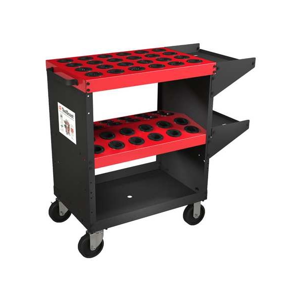CNC ToolScoot, 40 Taper, Heavy-Duty, Holds Up To 48 Tools, Number of Shelves 2 Adjustable, Load Rating 1000 Lb, Width 35 1/4 In, Depth 18 In, Height 35 In, Steel, Sides and Shelves 16 Gauge, Caster Type Plastic, 2 Swivel Locking And 2 Fixed, Caster Size 5 x 1 1/2 In, Black Cart With Red Shelves, Matted Sides, Gloss Shelves Finish, Rugged 12-Gauge Steel Handles, Includes Nylon Shelf Inserts And Rubber Tray Liners