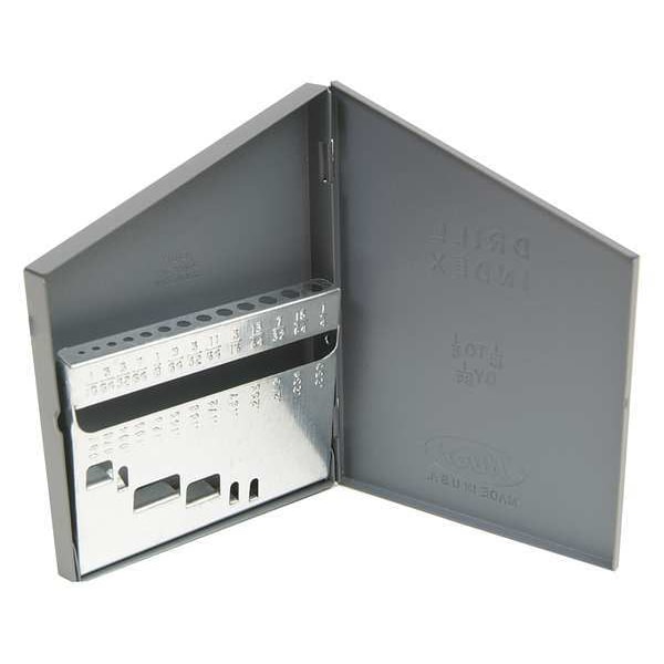 Drill Bit Case, Jobber Length, Holds 1/16 In. to 1/4 In. Fractions by 64ths, Steel, Overall Case Width (In.) 4, Overall Case Depth (In.) 5-3/8, Overall Case Height (In.) 5/16, Number of Compartments 13, Number of Drawers 1, Lock Included No, Tools Not Included