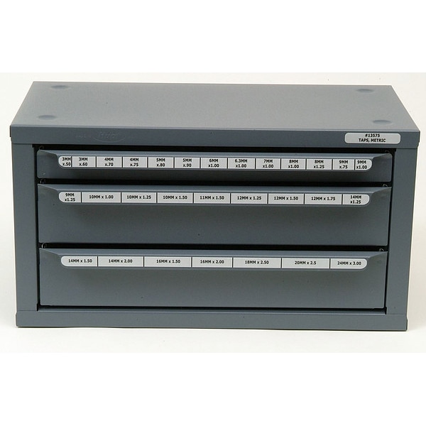 Tap Dispenser, Original, Metric Taps, Holds 3 To 24mm, Steel and Vinyl, Overall Case Width 14 5/8 In, Overall Case Depth 7 3/8 In, Overall Case Height 7 3/4 In, Number of Compartments 29, Number of Drawers 3, Cutting Tools Not Included