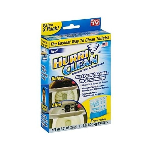 Now Hurriclean is new and improved. Larger Volume means more bang for your buck. Also, with more volume, the cyclonic reaction with water is stronger. The cleaning power is enhanced by adding more citric acid. The shelf life is even longer, the powder will not harden over time. Clean your toilet super-fast and easily with HurriClean! Hurriclean, As Seen on TV, features a powerful cyclonic foaming action so there's no scrubbing. Simply pour Hurriclean in the tank and it goes to work cleaning the tank and jet stream. HurriClean Automatic Toilet and Tank cleaner eliminates rust, mineral deposits and more. Safe on all parts- chlorine free and septic safe. Each set includes 3 packs of Hurriclean. Hurriclean Deluxe has more volume for your buck. Includes three 4 oz packets, 33% more than the original. Hurriclean Deluxe features a new and improved formula that eliminates hardening of the powder. More shelf life! The new Hurriclean formula has more citric acid than before which gives it more cleaning power. The larger volume means more chemical reaction with water, producing a powerful cyclonic foaming action that removes buildup, scum and rust marks. Hurriclean is still easy to easy to use, hands free, and safe