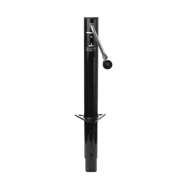 Husky Towing 88130 manual side-wind A-frame trailer tongue jack designed for lifting and supporting trailer tongues; rated for 2,000 lb tongue weight capacity; provides 14-13/16 in of lift; retracts to 9-1/8 in for maximum ground clearance; suitable for bolt-on or weld-on mounting applications. Manufactured from steel with black painted outer tube and zinc-plated inner components; round side-wind configuration with top-mounted operating handle; extended height 23-1/2 in; clearance 9-1/8 in; retracted height 9-1/8 in; non-swivel design; no attached wheels; quick-connect type supported; designed to accept a footpad; manual operation; bulk packaging; limited 1-year warranty; Prop 65 compliant.
